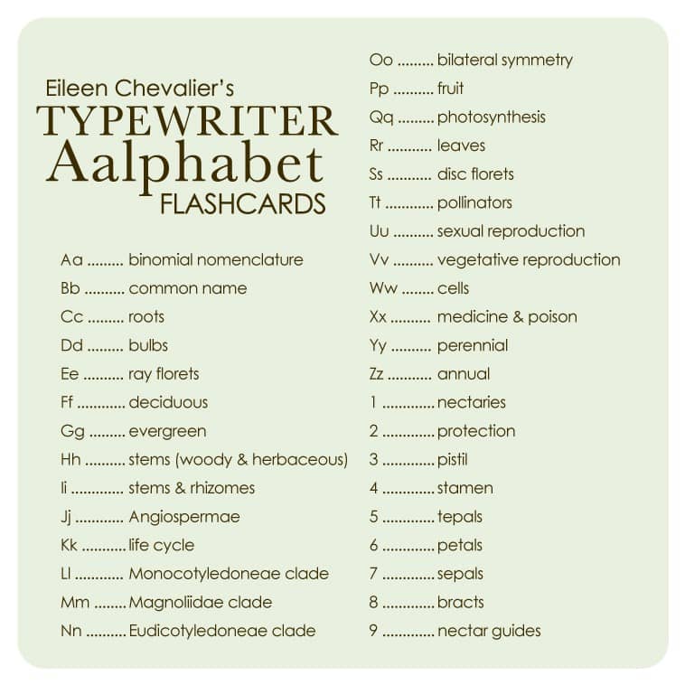 Eileen Chevalier’s Typewriter Aalphabet Botany Flashcards